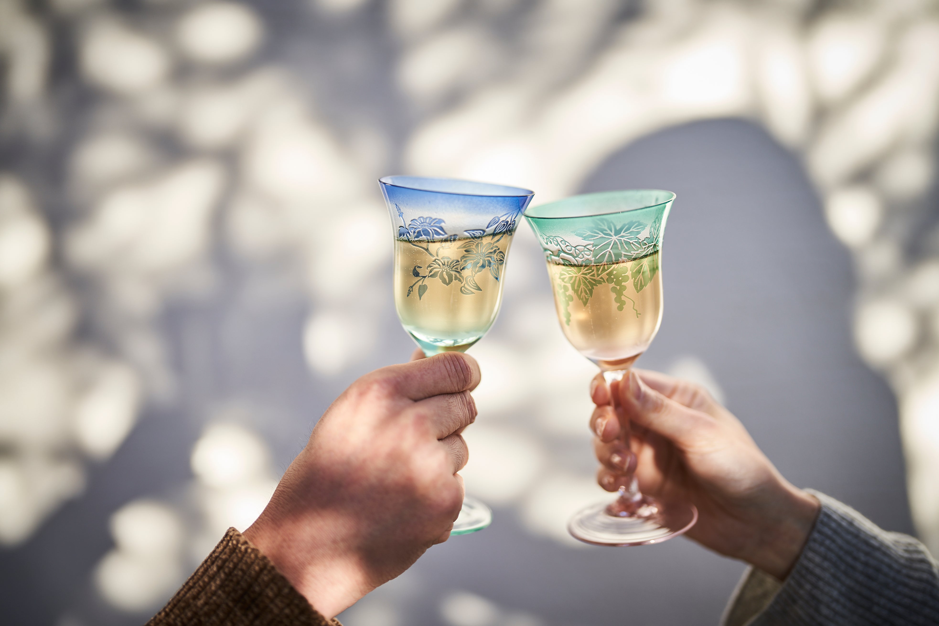そして太武朗工房では、ご夫婦や恋人同士の特別な時間を演出する贈り物として、ペアのワイングラスもラインナップ。ぶどう紋は実の粒の多さから「豊穣」と「多産」、蔓の伸びから「生命力」「結びつき」をあらわし、鉄線紋は蔓の丈夫さから「強い結びつき」をあらわすなど、どちらもパートナーとの末長いつながりを感じさせる縁起の良いモチーフです。ワインやシャンパンとセットで贈るのも粋かもしれませんね。