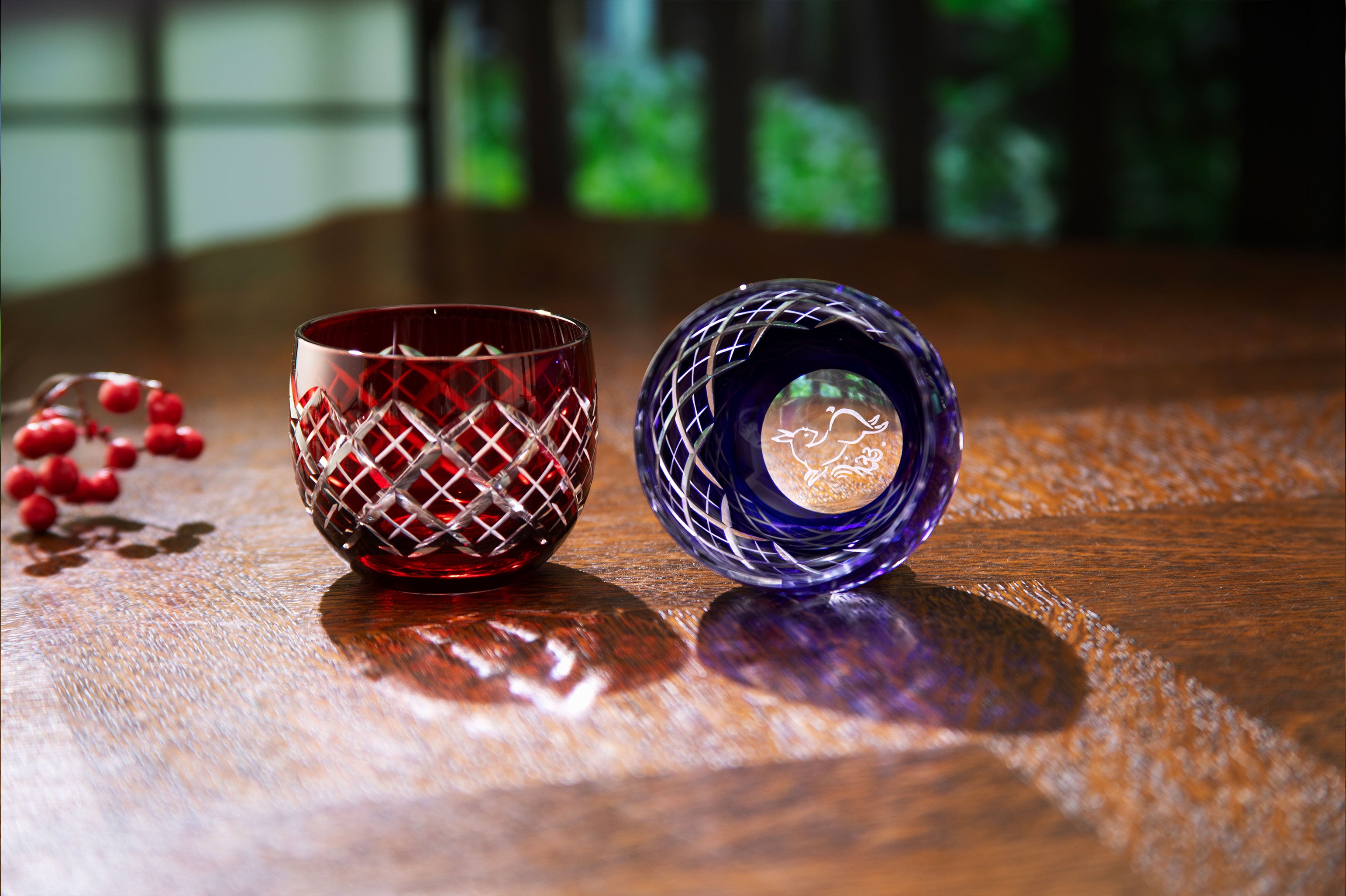 家内安全や飛躍を象徴するうさぎの柄の中には、遊び心で「う」の文字をあしらっています。また、紋様は江戸切子の代表的な「矢来紋」を採用しています。矢来とは竹や丸太を互い違いに組んだ形状をあらわし、築城や舞台装置の一番初めの段階に用いられるなど「物事の基盤を固める」という意味を持つことから、新年の始まりにも最適な紋様となっています。