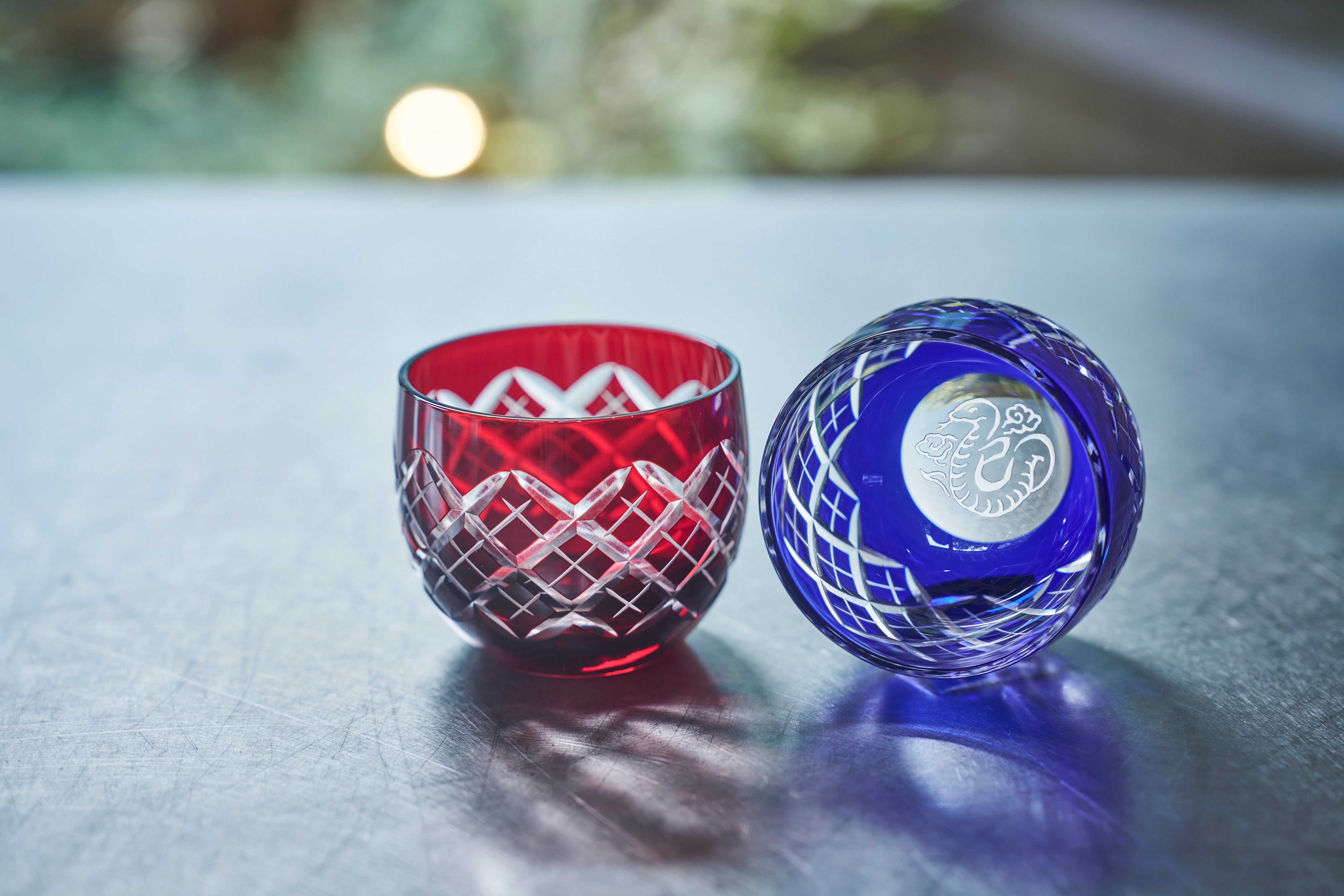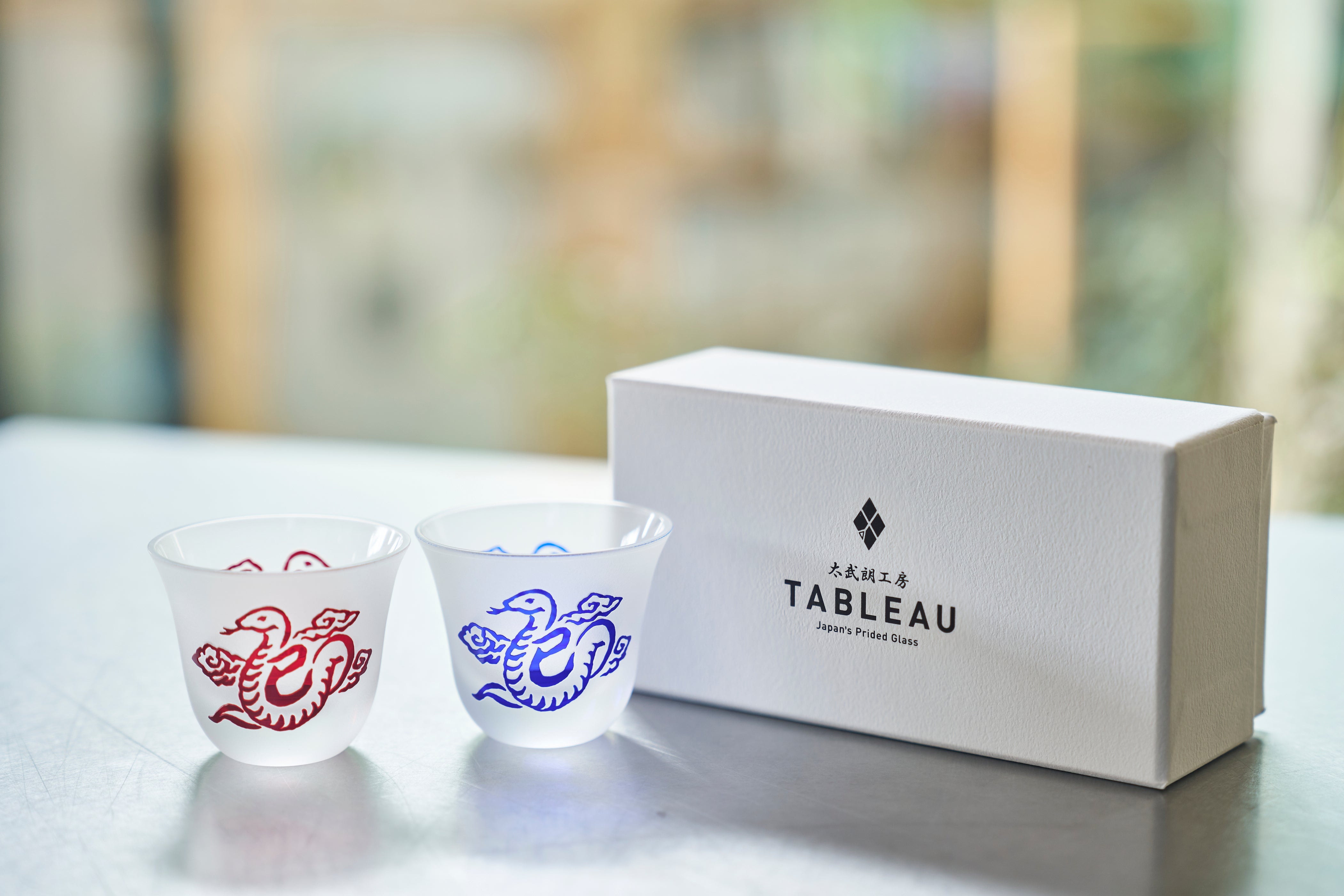 太武朗工房の2025年干支ぐい呑は、「乙巳」の組み合わせから、積み重ねた努力が花開くことを祈念し、頭を上げ前進する「蛇」の姿をデザインいたしました。威風堂々とした蛇の柄には、遊び心で「巳」 の文字を忍ばせております。また、紋様は江戸切子の伝統模様「矢来紋」を採用しています。矢来とは竹や丸太を互い違いに組んだ柵のこと。築城や舞台装置の最初の段に用いられることから、物事の基礎を作る・固めるという意味をもちます。新年の始まりに大変ふさわしい紋様です。