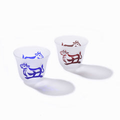 二層の色被せガラスを一つ一つ手吹きにて作り、その器に彫刻を手作業で施し、二色のコントラストで図柄を表現しています。
