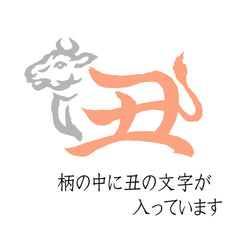 「丑」は、人と共に良く働く姿が「誠実・勤勉」とされ、また天神様の使いである事から学問に縁のある動物として愛されて参りました。 漢字の「紐」には「丑」の字が使われており、「結ぶ」「掴む」などの意味のある縁起の良い動物です。