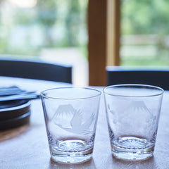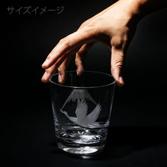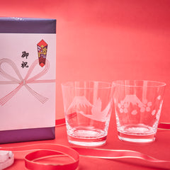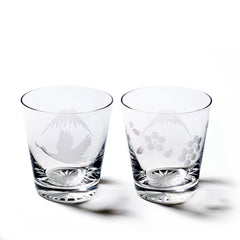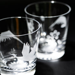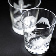 透明のガラスに花切子の技法で縁起の良い富士と鶴、富士と桜をカットしました。