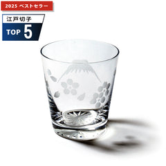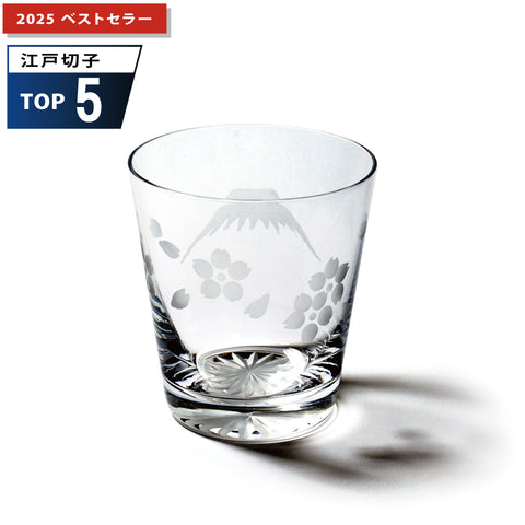 透明のガラスに花切子の技法で縁起の良い富士と桜をカットしました。