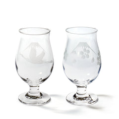 透明のガラスに花切子の技法で縁起の良い富士と鶴、富士山と桜をカットしました。