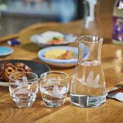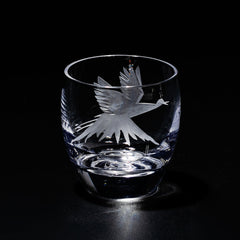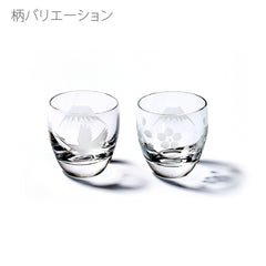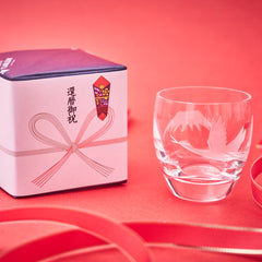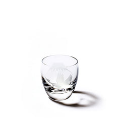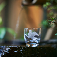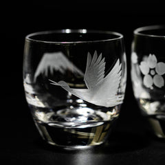 透明のガラスに花切子の技法で縁起の良い富士と鶴をカットしました。