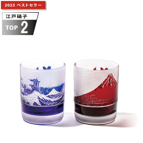 赤富士・波富士に桜 オールドグラスペア 赤・ルリ