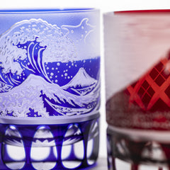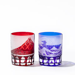 葛飾北斎による富嶽三十六景の代表作「凱風快晴」「神奈川沖波裏」をモチーフに、江戸切子の代表的な紋様「矢来」を施した 大変縁起の良いこだわりの逸品です。