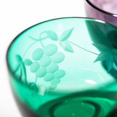 二層の色被せガラスに花切子の技法で縁起の良いぶどう紋をカットしました。