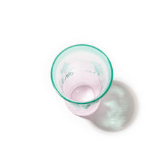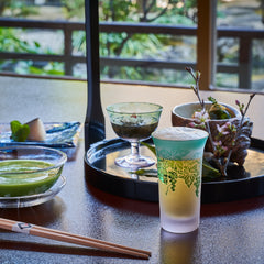 二層の色被せガラスを一つ一つ手吹きにて作り、その器に彫刻を手作業で施し、二色のコントラストで図柄を表現しています。