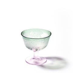 二層の色被せガラスを一つ一つ手吹きにて作り、その器に彫刻を手作業で施し、二色のコントラストで図柄を表現しています。