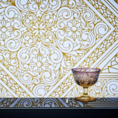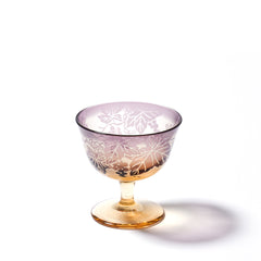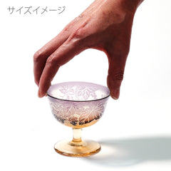 二層の色被せガラスを一つ一つ手吹きにて作り、その器に彫刻を手作業で施し、二色のコントラストで図柄を表現しています。