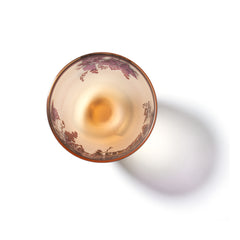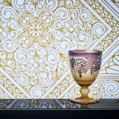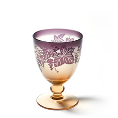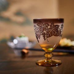 二層の色被せガラスを一つ一つ手吹きにて作り、その器に彫刻を手作業で施し、二色のコントラストで図柄を表現しています。