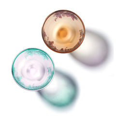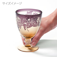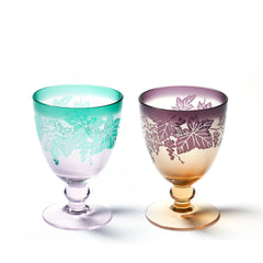 二層の色被せガラスを一つ一つ手吹きにて作り、その器に彫刻を手作業で施し、二色のコントラストで図柄を表現しています。