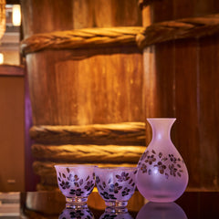 二層の色被せガラスを一つ一つ手吹きにて作り、その器に彫刻を手作業で施し、二色のコントラストで図柄を表現しています。