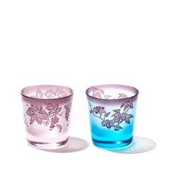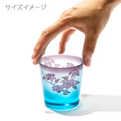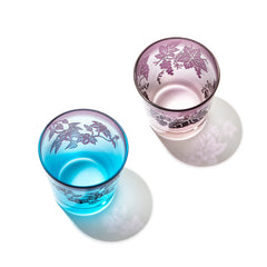 二層の色被せガラスを一つ一つ手吹きにて作り、その器に彫刻を手作業で施し、二色のコントラストで図柄を表現しています。