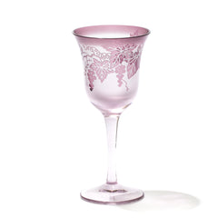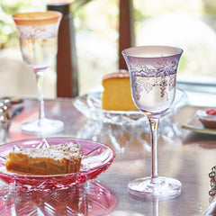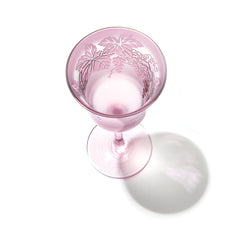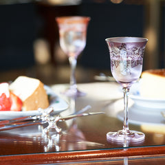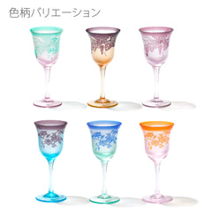 二層の色被せガラスを一つ一つ手吹きにて作り、その器に彫刻を手作業で施し、二色のコントラストで図柄を表現しています。