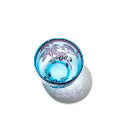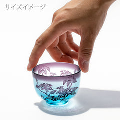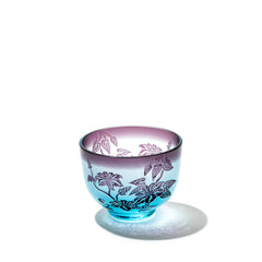 二層の色被せガラスを一つ一つ手吹きにて作り、その器に彫刻を手作業で施し、二色のコントラストで図柄を表現しています。