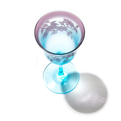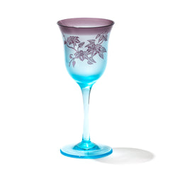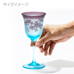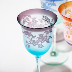 二層の色被せガラスを一つ一つ手吹きにて作り、その器に彫刻を手作業で施し、二色のコントラストで図柄を表現しています。鉄線は、蔓が鉄の線のように丈夫なことから「強い結びつき」を表し、 加えて「心の美しさ」「高潔」という花言葉を持つ大変縁起の良い紋様です。