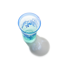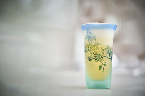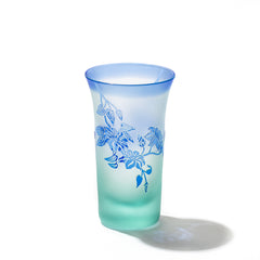 二層の色被せガラスを一つ一つ手吹きにて作り、その器に彫刻を手作業で施し、二色のコントラストで図柄を表現しています。