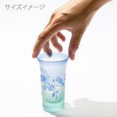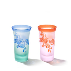 二層の色被せガラスを一つ一つ手吹きにて作り、その器に彫刻を手作業で施し、二色のコントラストで図柄を表現しています。
