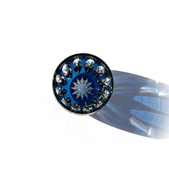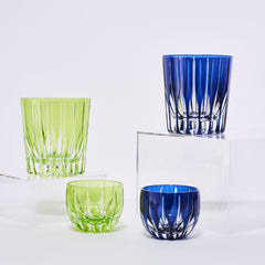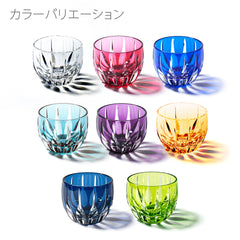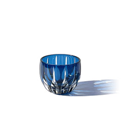剣の形の菱が連なる剣菱紋。 剣は古くは神器とされ 災いを断ち運を切り開くものとされる縁起の良いモチーフです。 縦に流れるすっきりとしたカットは伝統とモダンを兼ね備えた逸品です。このグラスは、江戸切子として稀少な藍色の色被せ硝子を使用しています。7世紀頃日本へ伝わり、貴族から武士、そして庶民へと身分・地域を超え広まり日本を彩った藍。明治に日本を訪れた英国人科学者ロバート・ウィリアム・アトキンソンによって「ジャパン・ブルー」と表現され、日本象徴する色として世界へ発信された日本独自の青を色硝子にて表現しています。
