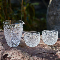籠の目を図案化し、古来より魔除けとされた「籠目紋」、 不老長寿を表す菊花が連なり咲き誇る様を表す「菊繋ぎ紋」。 二種類の紋様を交互に配した縁起の良い江戸切子です。