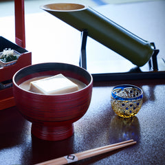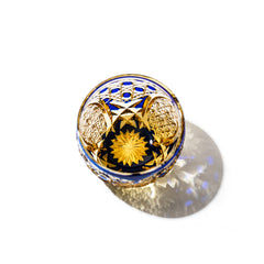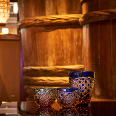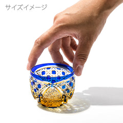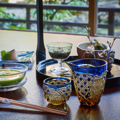 籠の目を図案化し、古来より魔除けとされた「籠目紋」、 不老長寿を表す菊花が連なり咲き誇る様を表す「菊繋ぎ紋」。 二種類の紋様を交互に配した縁起の良い江戸切子です。