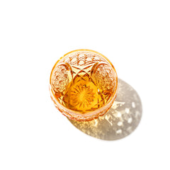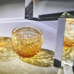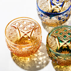 籠の目を図案化し、古来より魔除けとされた「籠目紋」、 不老長寿を表す菊花が連なり咲き誇る様を表す「菊繋ぎ紋」。 二種類の紋様を交互に配した縁起の良い江戸切子です。