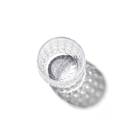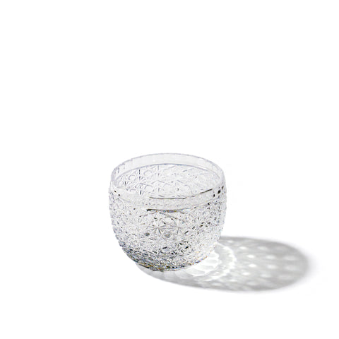 江戸切子の代表的な紋様「菊籠目(かごめ)」紋。 籠の目を図案化し、古来より 「魔除け」の象徴と伝えられる「籠目紋」と不老長寿を表す「菊花紋」が連なる大変縁起の良い柄です。
