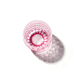 江戸切子の代表的な紋様「菊籠目(かごめ)」紋。 籠の目を図案化し、古来より 「魔除け」の象徴と伝えられる「籠目紋」と不老長寿を表す「菊花紋」が連なる大変縁起の良い柄です。