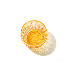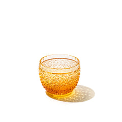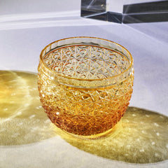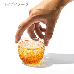 江戸切子の代表的な紋様「菊籠目(かごめ)」紋。 籠の目を図案化し、古来より 「魔除け」の象徴と伝えられる「籠目紋」と不老長寿を表す「菊花紋」が連なる大変縁起の良い柄です。