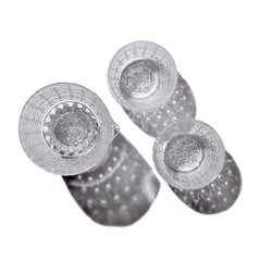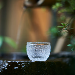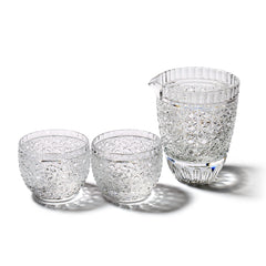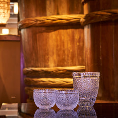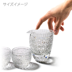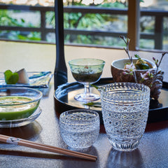 江戸切子の代表的な紋様「菊籠目(かごめ)」紋。 籠の目を図案化し、古来より 「魔除け」の象徴と伝えられる「籠目紋」と不老長寿を表す「菊花紋」が連なる大変縁起の良い柄です。