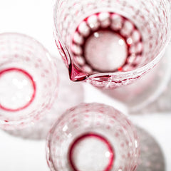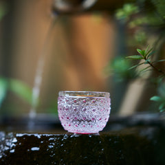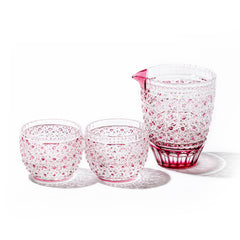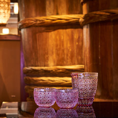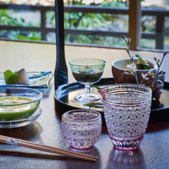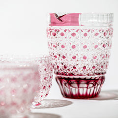 江戸切子の代表的な紋様「菊籠目(かごめ)」紋。 籠の目を図案化し、古来より 「魔除け」の象徴と伝えられる「籠目紋」と不老長寿を表す「菊花紋」が連なる大変縁起の良い柄です。