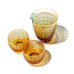 江戸切子の代表的な紋様「菊籠目(かごめ)」紋。 籠の目を図案化し、古来より 「魔除け」の象徴と伝えられる「籠目紋」と不老長寿を表す「菊花紋」が連なる大変縁起の良い柄です。
