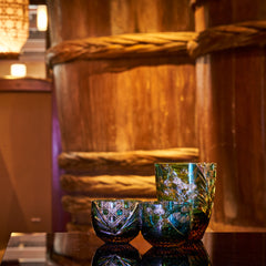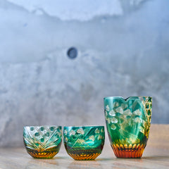 純国産クリスタルガラスを使用し、「富士山と松」を切子で表現しました。