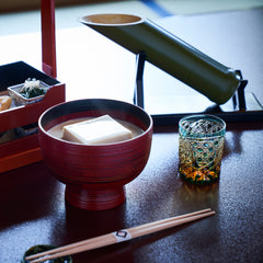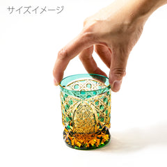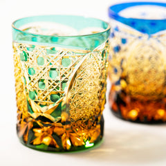 籠の目を図案化し、古来より魔除けとされた「籠目紋」、 不老長寿を表す菊花が連なり咲き誇る様を表す「菊繋ぎ紋」。 二種類の紋様を交互に配した縁起の良い江戸切子です。