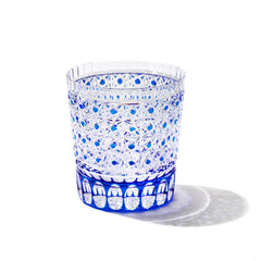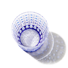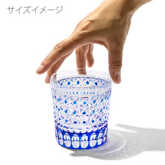 江戸切子の代表的な紋様「菊籠目(かごめ)」紋。 籠の目を図案化し、古来より 「魔除け」の象徴と伝えられる「籠目紋」と不老長寿を表す「菊花紋」が連なる大変縁起の良い柄です。