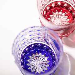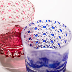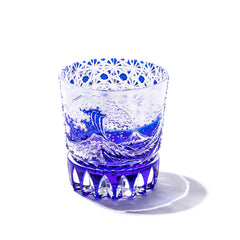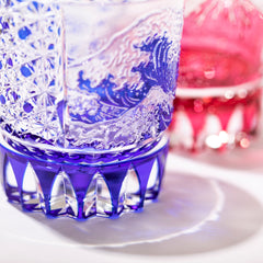 葛飾北斎による富嶽三十六景の代表作「神奈川沖波裏」をモチーフに、江戸切子の代表的な紋様「菊籠目」を施した 大変縁起の良いこだわりの逸品です。