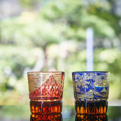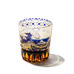 葛飾北斎による富嶽三十六景の代表作「神奈川沖波裏」をモチーフに、江戸切子の代表的な紋様「菊籠目」を施した 大変縁起の良いこだわりの逸品です。