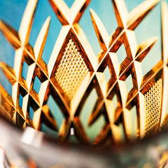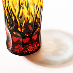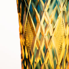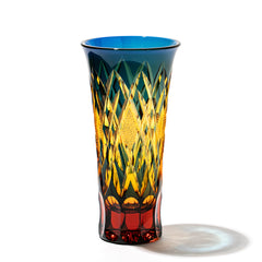 江戸切子の代表的な紋様「矢来魚子(やらいななこ)」紋。竹や丸太を互い違いに組んだ形状の事を指し、 「物事の基礎を作る」「基盤を固める」とされる矢来と 魚のうろこを意味し、 数の多いという意味合いから 多産・豊かさを表す魚子を組み合わせた 大変縁起の良い伝統紋様の一つです。