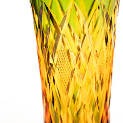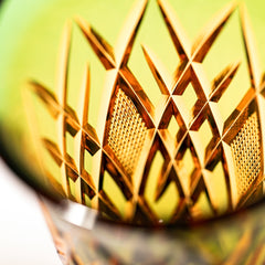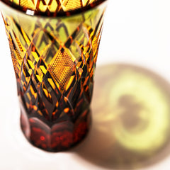 江戸切子の代表的な紋様「矢来魚子(やらいななこ)」紋。竹や丸太を互い違いに組んだ形状の事を指し、 「物事の基礎を作る」「基盤を固める」とされる矢来と 魚のうろこを意味し、 数の多いという意味合いから 多産・豊かさを表す魚子を組み合わせた 大変縁起の良い伝統紋様の一つです。