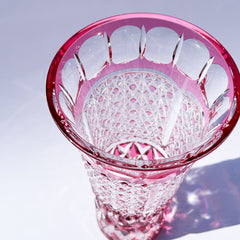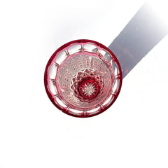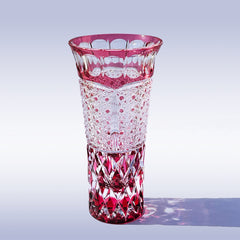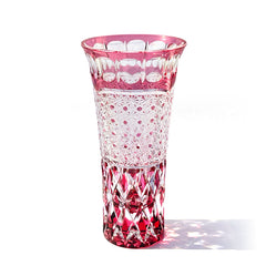 江戸切子の代表的な紋様「菊籠目(かごめ)」紋。 籠の目を図案化し、古来より 「魔除け」の象徴と伝えられる「籠目紋」と不老長寿を表す「菊花紋」が連なる大変縁起の良い柄です。