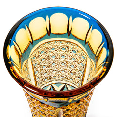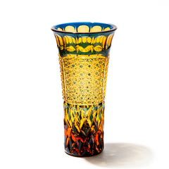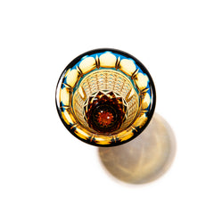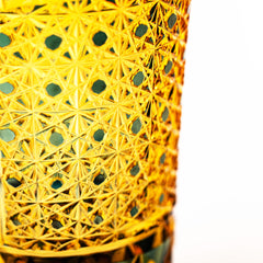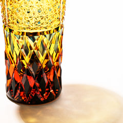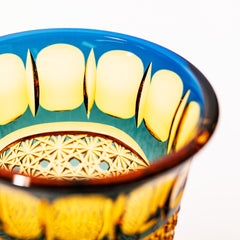 江戸切子の代表的な紋様「菊籠目(かごめ)」紋。 籠の目を図案化し、古来より 「魔除け」の象徴と伝えられる「籠目紋」と不老長寿を表す「菊花紋」が連なる大変縁起の良い柄です。