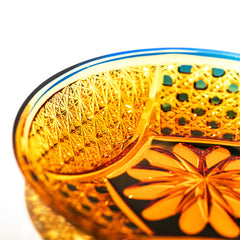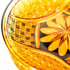 籠の目を図案化し、古来より魔除けとされた「籠目紋」、 不老長寿を表す菊花が連なり咲き誇る様を表す「菊繋ぎ紋」。 二種類の紋様を交互に配した縁起の良い江戸切子です。