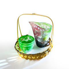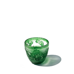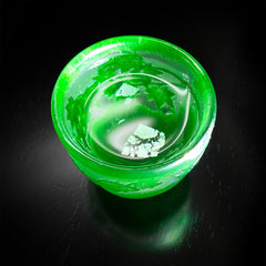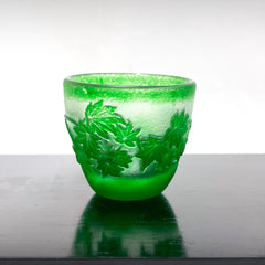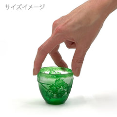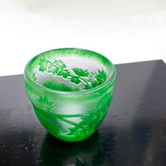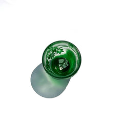 上向きに広がる形状が手になじみやすいぐい吞。瑞々しい緑色の被せ硝子に、繊細な紅葉を彫刻しています。底部に閉じ込めた銀箔の輝きが、お酒をそそいだ時に輝きを増し、目を楽しませます。