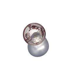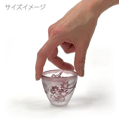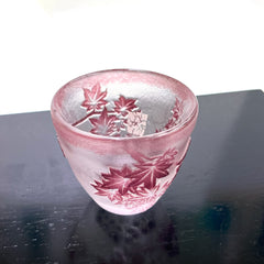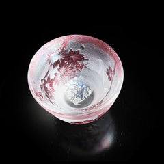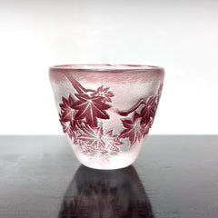上向きに広がる形状が手になじみやすいぐい吞。上品な赤紫色の被せ硝子に、繊細な紅葉を彫刻しています。底部に閉じ込めた銀箔の輝きが、お酒をそそいだ時に輝きを増し、目を楽しませます。