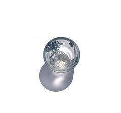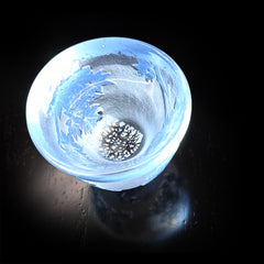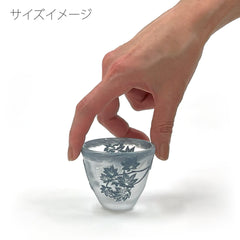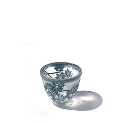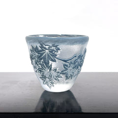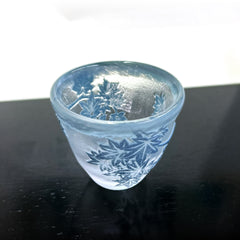 上向きに広がる形状が手になじみやすいぐい吞。涼しげな青灰色の被せ硝子に、繊細な紅葉を彫刻しています。底部に閉じ込めた銀箔の輝きが、お酒をそそいだ時に輝きを増し、目を楽しませます。