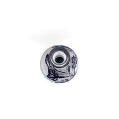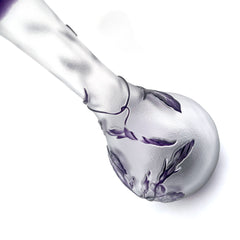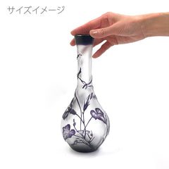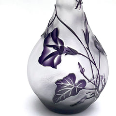上品な紫色の一輪挿し。シックな紫色と透きの色合わせは、生ける草花を引き立てます。その一方で、ぐるりと巻き付く形に彫刻された朝顔が様々な角度から目を楽しませる、花瓶単体としても飾れるデザインとなっています。